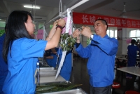 在比赛开始前,员工们围在一起互相探讨学习包粽子的方法和技巧,气氛十分热烈。随后一声令下,一时间粽叶舞动,麻绳穿梭。有的员工双手将粽子叶卷成漏斗状后,用糯米充实压紧,再用细绳打个结,动作麻利优美,转眼间就包出了一个棱角分明的粽子;也有的员工因为没有经验,绳子还没来得及捆,粽子叶就散了,糯米又洒回盆里。几分钟后,各种奇形怪状的粽子开始成形,有三角的,四角的,长方形的,扁平状的,颇有特色。尽管大家都是包粽子的门外汉,但看着自己的杰作却也爱不释手。大家互相“品头论足”现场笑声不断,拍照留恋其乐融融。裁判组综合分析速度、质量等各方面,最终评出了名次,来自产品检验科的陈文芳、蔡玉红摘得桂冠,二车间、六车间代表队获二等奖,一车间、技术质量部、财务资产管理部获三等奖,其余参赛员工也都获得了小礼品。员工们开心地说:“公司就像这粽叶,员工就像粽子的一粒粒米,而活动就像这条扎粽子的绳,把我们和公司紧紧地凝聚在一起,让我们感受到大家庭的温暖”。