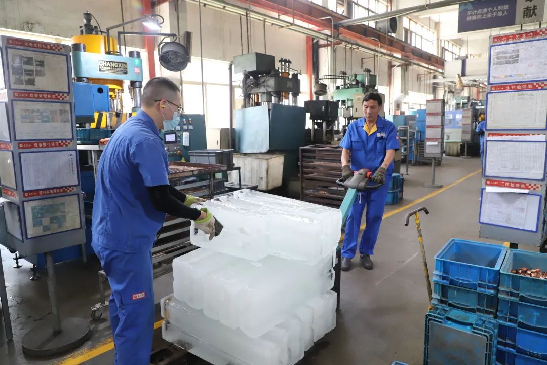 户外骄阳似火,而车间的生产也是热火朝天。由于车间内空气不流通,吹来的风都带着热气。还有机器运行发出的隆隆声,更让人心生躁意。为此每年夏季公司都会采购冰块运送至车间,为大家降温解暑。
